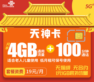 月租19元=4G国内流量+1元/1G/天+100分钟免费通话+5个联通亲情号(含首年每月1G优惠)